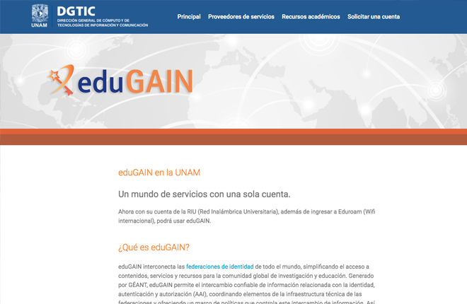 La Coordinación de Atención a Usuarios (CAU) de la Dirección de Telecomunicaciones, ha concluído el proceso para poner a disposición de estudiantes y personal académico de la UNAM el servicio eduGAIN, que les permitirá tener acceso a contenidos, servicios y recursos de investigación y educación de diversas instituciones universitarias nacionales y de otros países, además de descuentos o descargas gratis de software como Tableau, Autodesk, o en servicios como  Spotify, Youtube, etc.