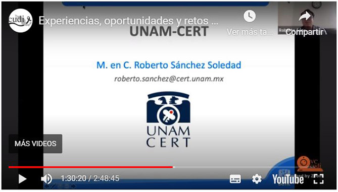 Durante su presentación, el Mtro. Sánchez destacó que el Equipo de Respuesta a Incidentes de la UNAM (CERT-UNAM), el cual surgió hace 27 años, se ha esforzado en implementar una red de monitoreo de seguridad a través de sensores desplegados en toda la red universitaria, los cuales permiten identificar ataques y así poder responder de manera proactiva ante ellos. Comentó también que derivado de la pandemia y ya que gran parte de los equipos de cómputo de la universidad se encuentran apagados, durante los últimos meses se ha observado una disminución en los intentos de intrusión.