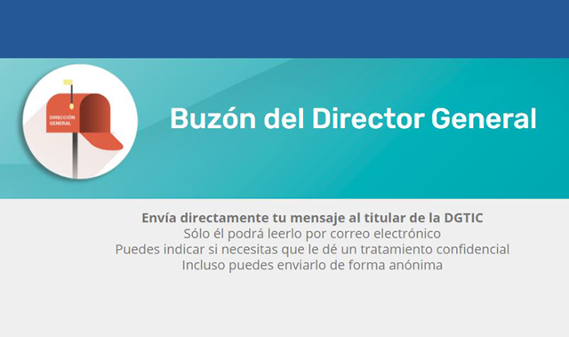 Con la finalidad de que el personal de la DGTIC tenga comunicación directa con el titular de la dependencia, por indicaciones del doctor Héctor Benítez Pérez, se presenta el Buzón de la Dirección General.