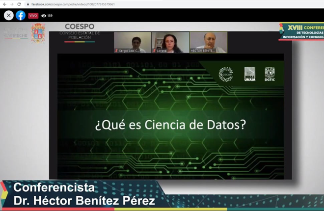 La XVIII Conferencia de Tecnologías de la Información y la Comunicación, organizada por el Consejo Estatal de Población del estado de Campeche, que se realizó de forma virtual, del 10 al 12 de noviembre, contó con la participación como conferencista y panelista, del Dr. Héctor Benítez Pérez, titular de la DGTIC de la UNAM.