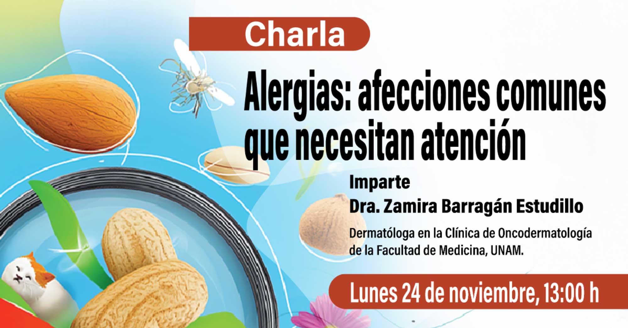 Comprender el origen de las alergias y reconocer sus síntomas para prevenir complicaciones fueron los objetivos de la charla en línea “Alergias: afecciones comunes que necesitan atención”, dirigida a la comunidad DGTIC e impartida por la doctora Zamira Barragán Estudillo, dermatóloga de la Clínica de Oncodermatología de la Facultad de Medicina de la UNAM.