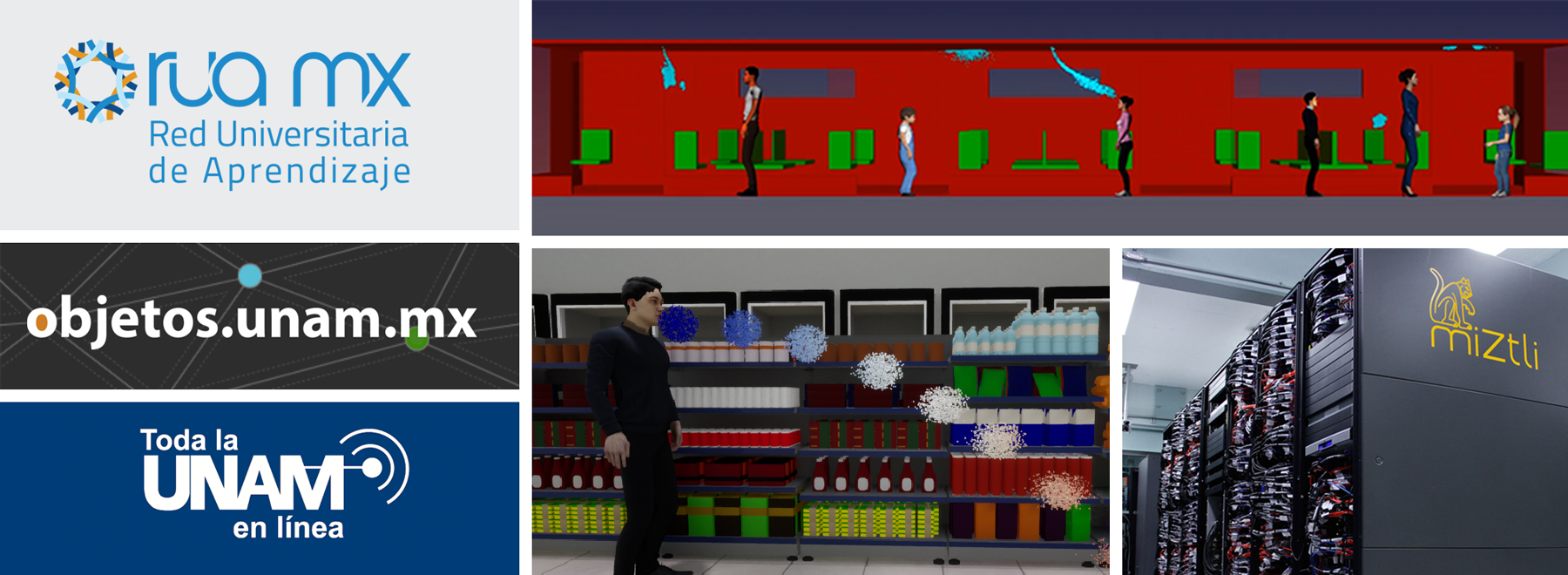 Animaciones en 3D recrearon la trayectoria de partículas de saliva en espacios como un vagón del Metro, una tienda de conveniencia y una casa habitación. Las visualizaciones tridimensionales fueron desarrolladas por la DGTIC, a partir de un proyecto de investigación de la Facultad de Ingeniería de la UNAM, en donde se analiza la transportación, dispersión, precipitación y concentración de gotas de saliva en espacios públicos, al hablar, estornudar o toser. Y se realizó además, el modelado tridimensional de 15 especies de aves de la REPSA.