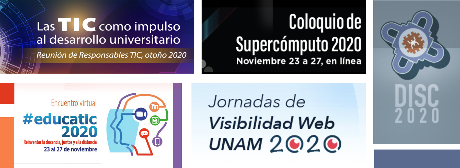 En noviembre se llevaron a cabo cinco grandes eventos: “Las TIC como impulso al desarrollo universitario”, que fue el marco para la integración de la Red de Responsables TIC de la UNAM, las Jornadas de Visibilidad Web 2020, EducaTIC 2020, el Coloquio Virtual de Supercómputo 2020, más la celebración del Día Internacional de la Seguridad en Cómputo, todos ellos enfocados en lograr la transformación digital de nuestra Universidad.