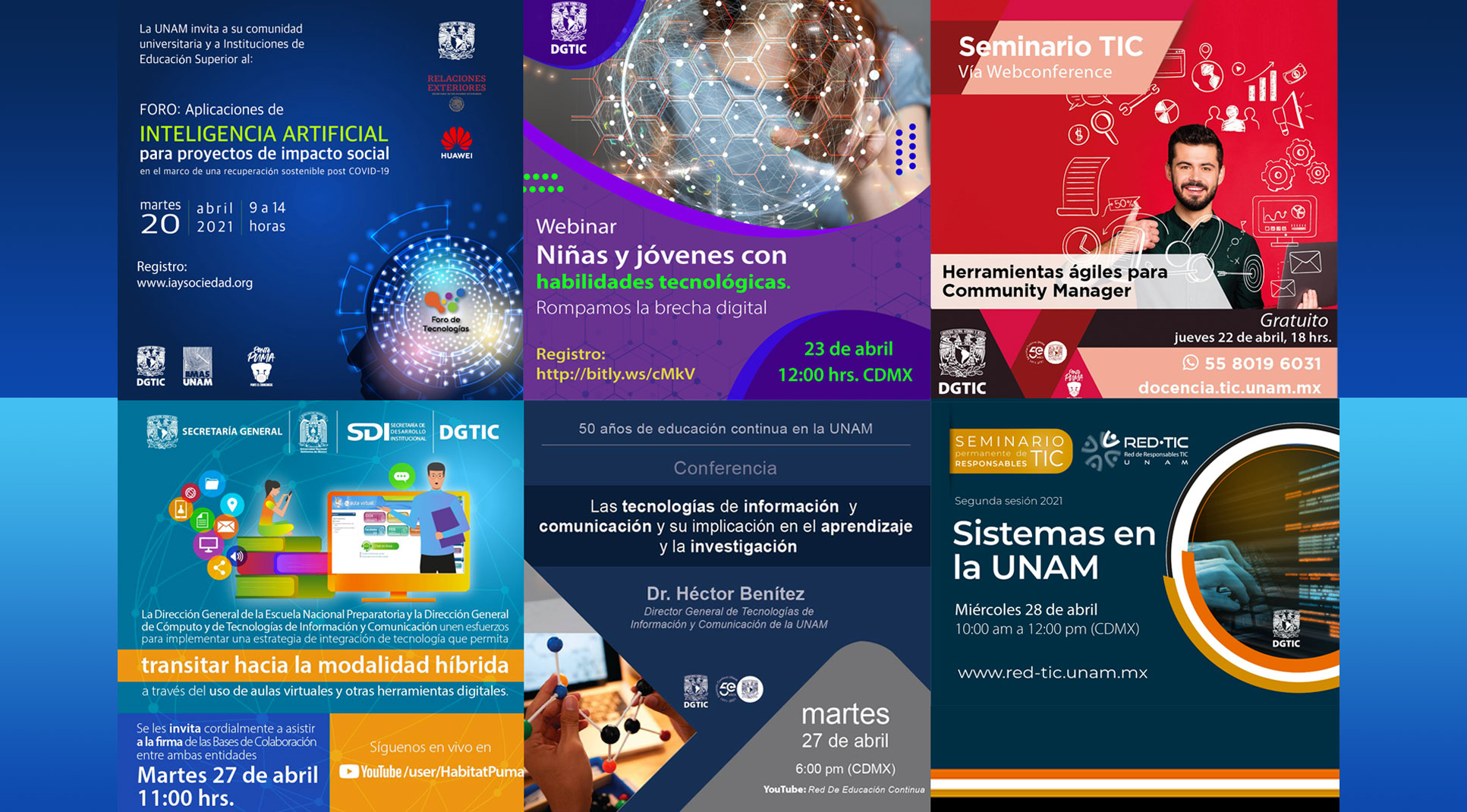 Ver otros números del Boletín Créditos Boletín informativo para el personal de la DGTIC Boletín 21, 3 de mayo de 2021 La DGTIC organizó del 19 al 28 de abril seis eventos en los cuales participaron más de 2,600 asistentes en total Se formaliza la colaboración entre DGTIC y la DGENP para la transformación del modelo educativo en la UNAM Retos, beneficios y oportunidades del uso de las TIC Se concreta alianza entre la UNAM, SRE y Huawei para capacitación digital en México La fuerza de una red de colaboración es la participación de sus Integrantes Desde la infancia, el entusiasmo de las mujeres por las TIC se hace valer Diálogo para identificar retos y oportunidades de la RNEI DGTIC contribuye en la actualización de publicaciones digitales Guía de especialistas en salud física y mental, en home office DGTIC incluye publicación en Libros UNAM Open Access Impulso al posicionamiento de repositorios institucionales en buscadores Recomendaciones para la administración de redes sociales en el Seminario TIC Becas para 123 estudiantes durante el primer periodo 2021 Nuevas tecnologías de colaboración llegaron para quedarse Pódcast: la evolución de la forma de consumir de contenidos Eventos próximos