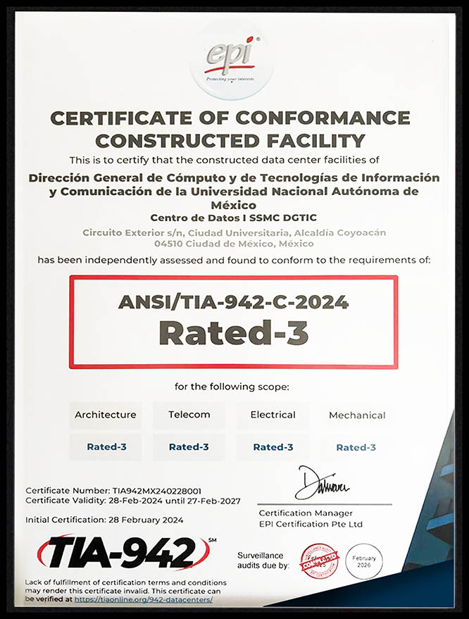 La UNAM mejoró la certificación del Centro de Datos I SSMC DGTIC obtenida hace un año. Ahora alcanzó el Rated-3 en todos los ámbitos del estándar ANSI/TIA-942-C: mecánico, eléctrico, arquitectónico y de telecomunicaciones. De esta forma, se convirtió en la primera institución de educación superior mexicana en conseguir este logro.
