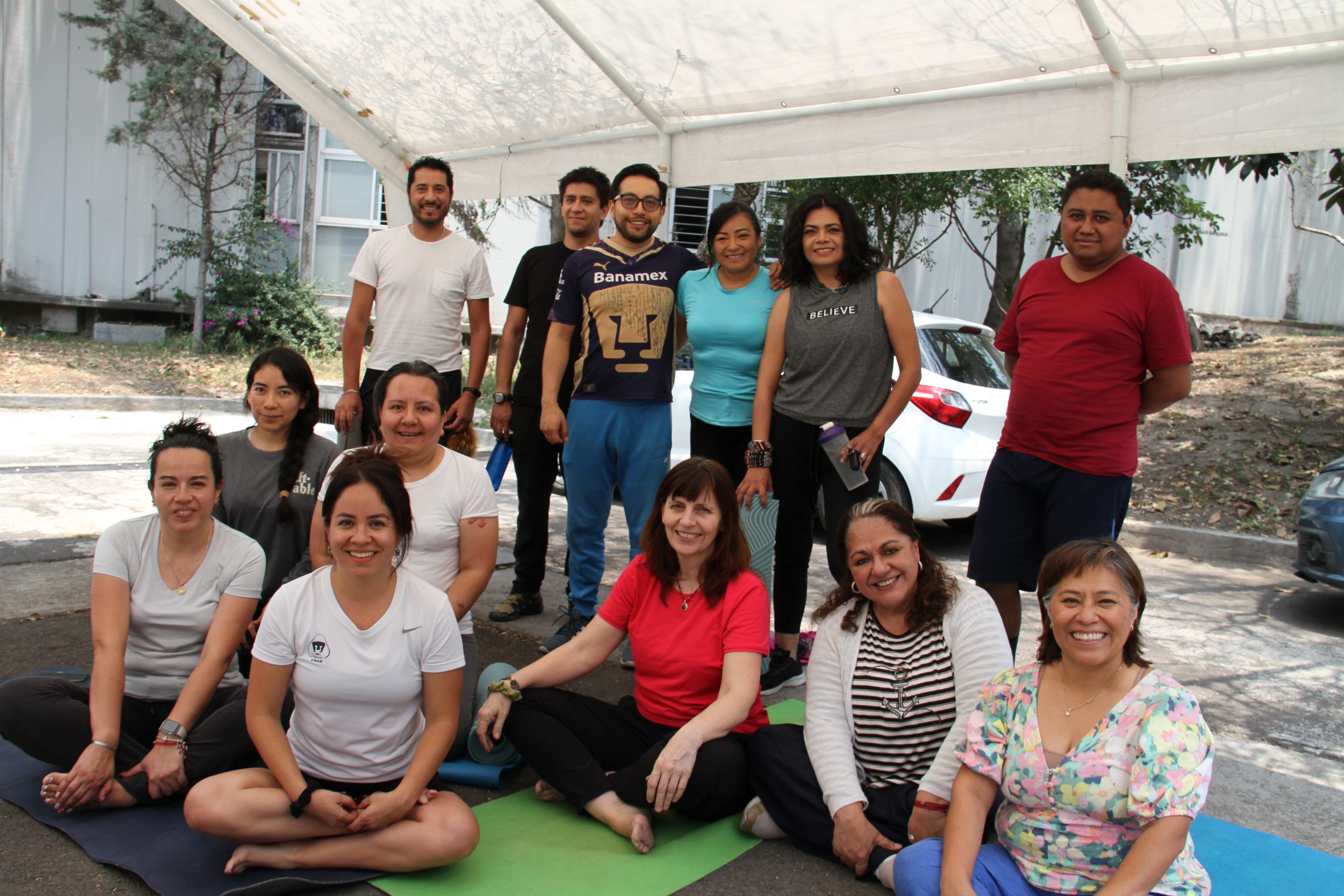 Con sus tapetes extendidos bajo la sombra de las carpas colocadas en el estacionamiento de proveedores del edificio principal de la DGTIC, integrantes de nuestra comunidad se reunieron para tomar la primera clase de yoga, impartida por la instructora Ana Laura Valdez de la Dirección General del Deporte Universitario de la UNAM.