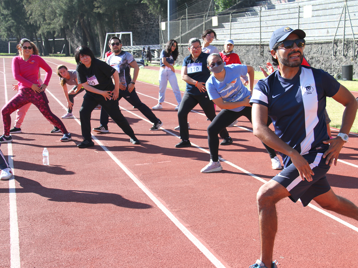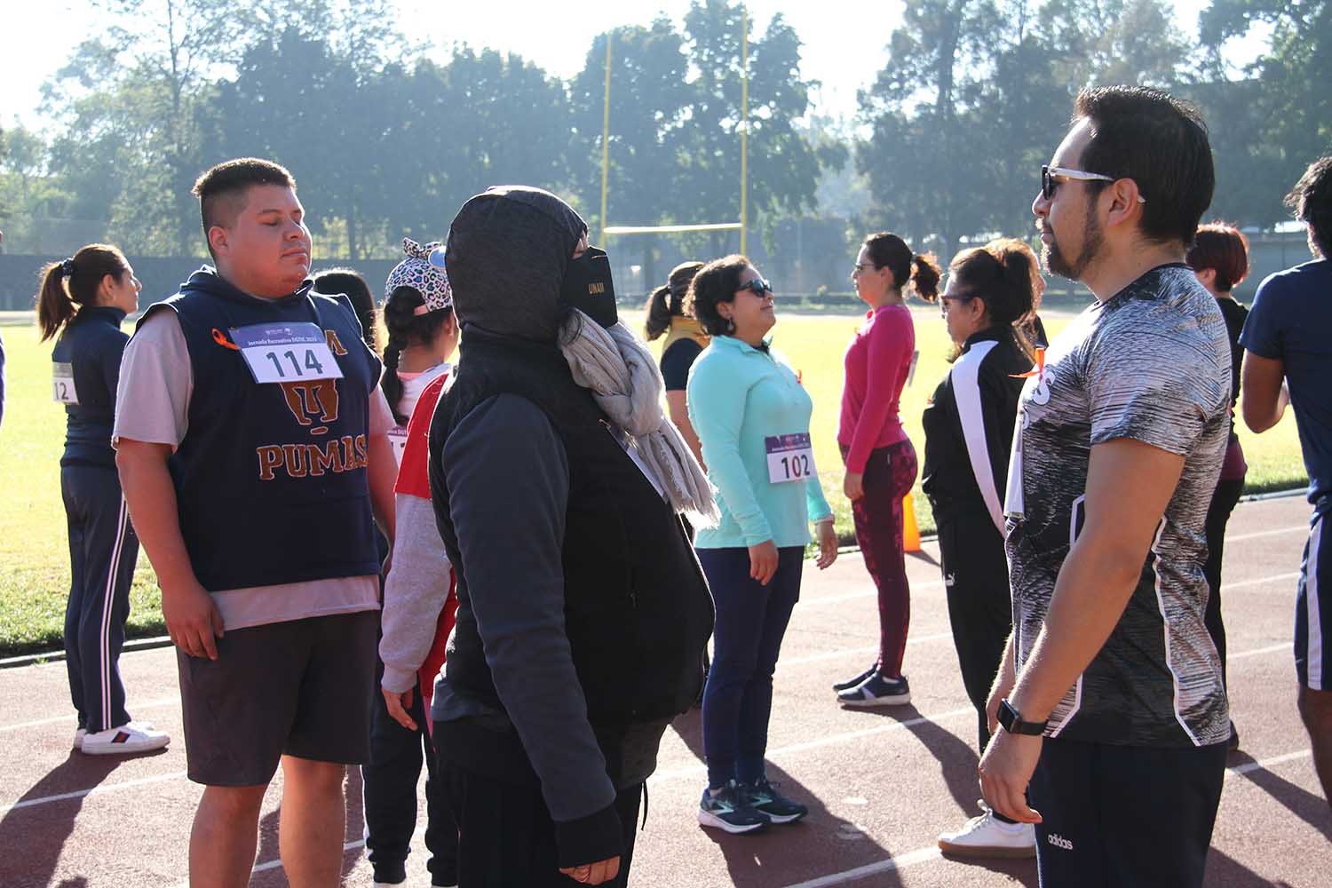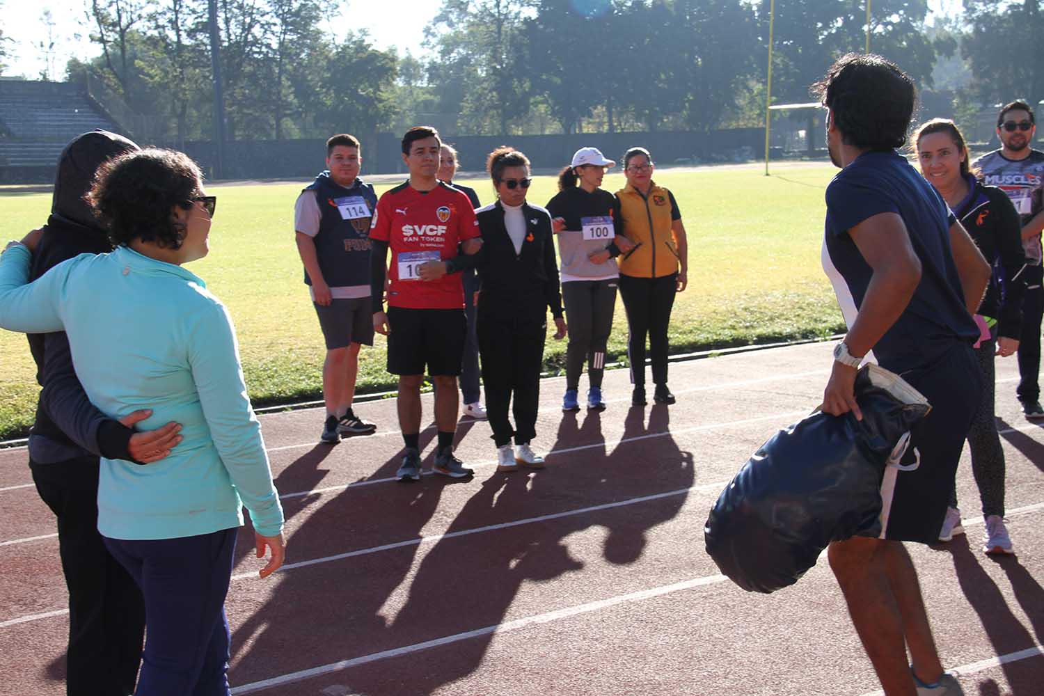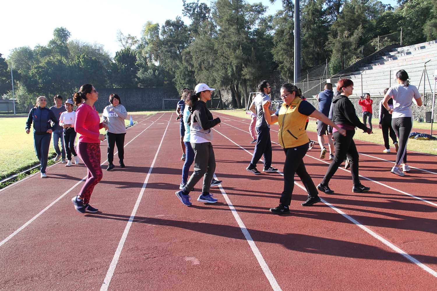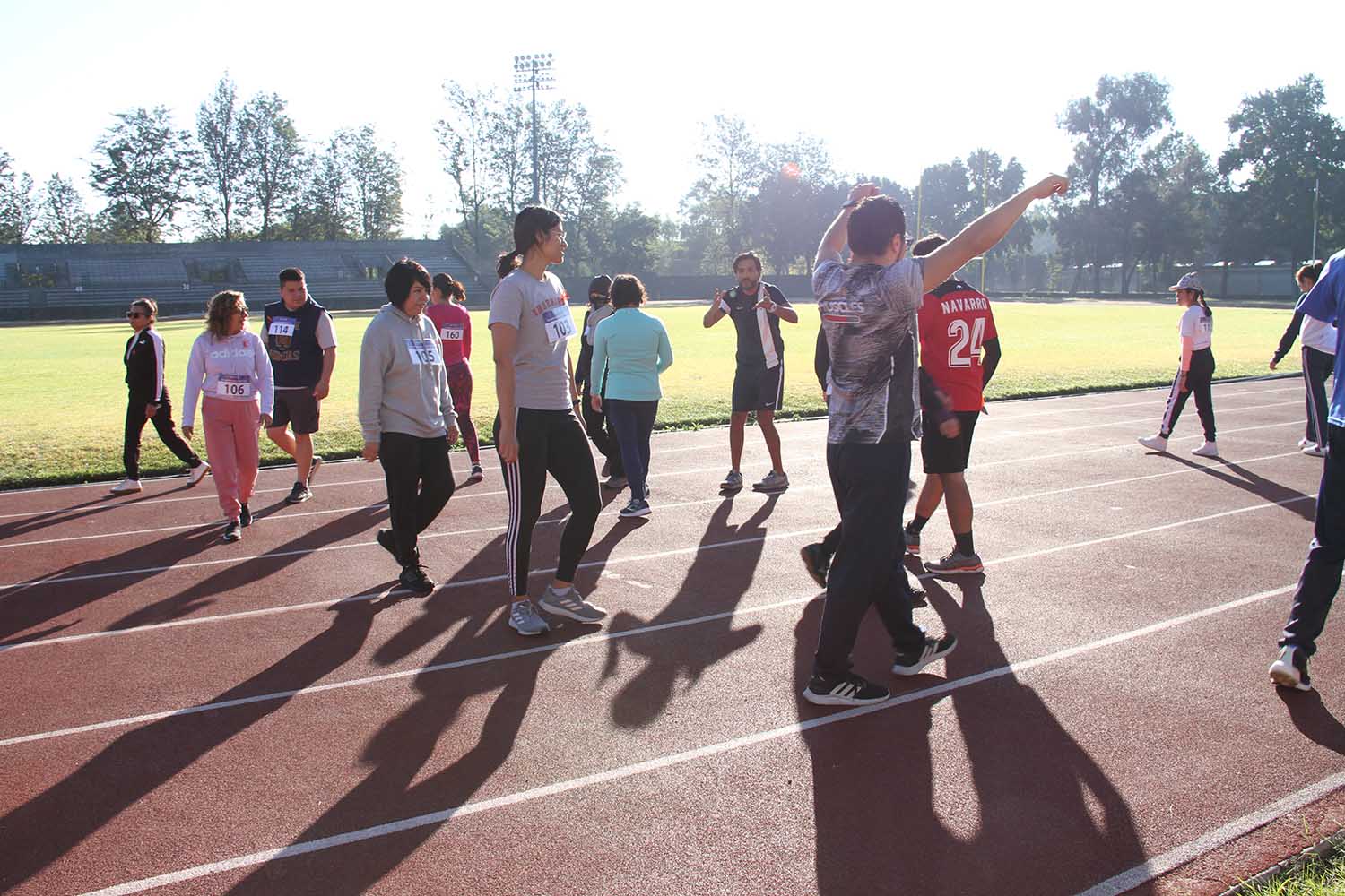 La jornada inició con ejercicios de movilidad y calentamiento a cargo de Miguel Ángel Ramírez Hernández, instructor de la Dirección General del Deporte Universitario (DGDU), quien realizó dinámicas divertidas y de integración que prepararían a los participantes para arrancar la carrera-caminata, la cual consistió en correr, trotar o caminar durante 30 minutos en la pista de tartán, disfrutando del sol y del clima fresco que favoreció el evento.