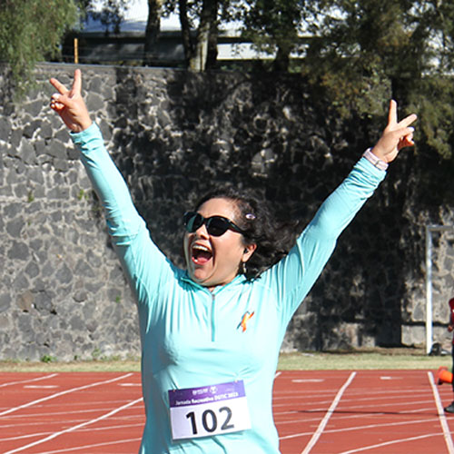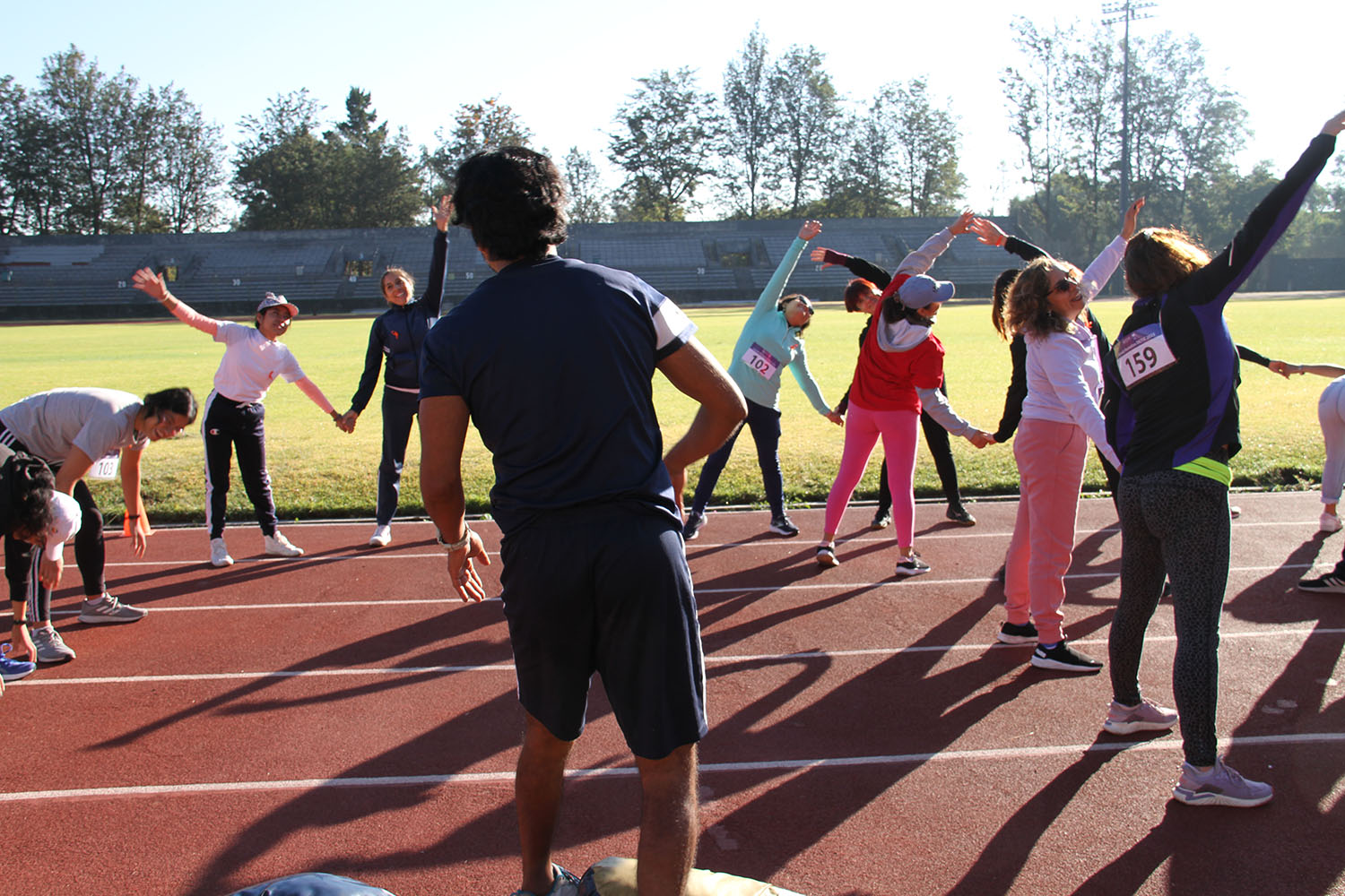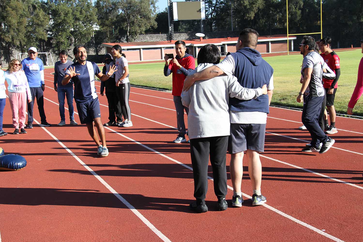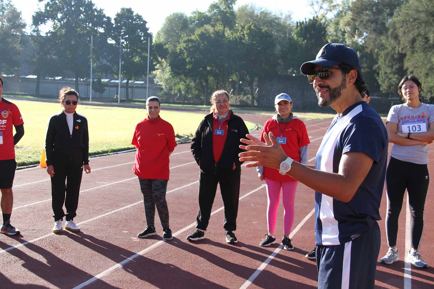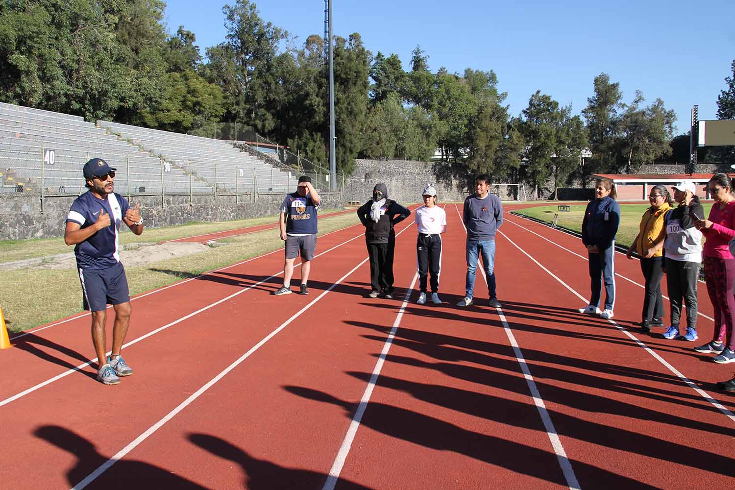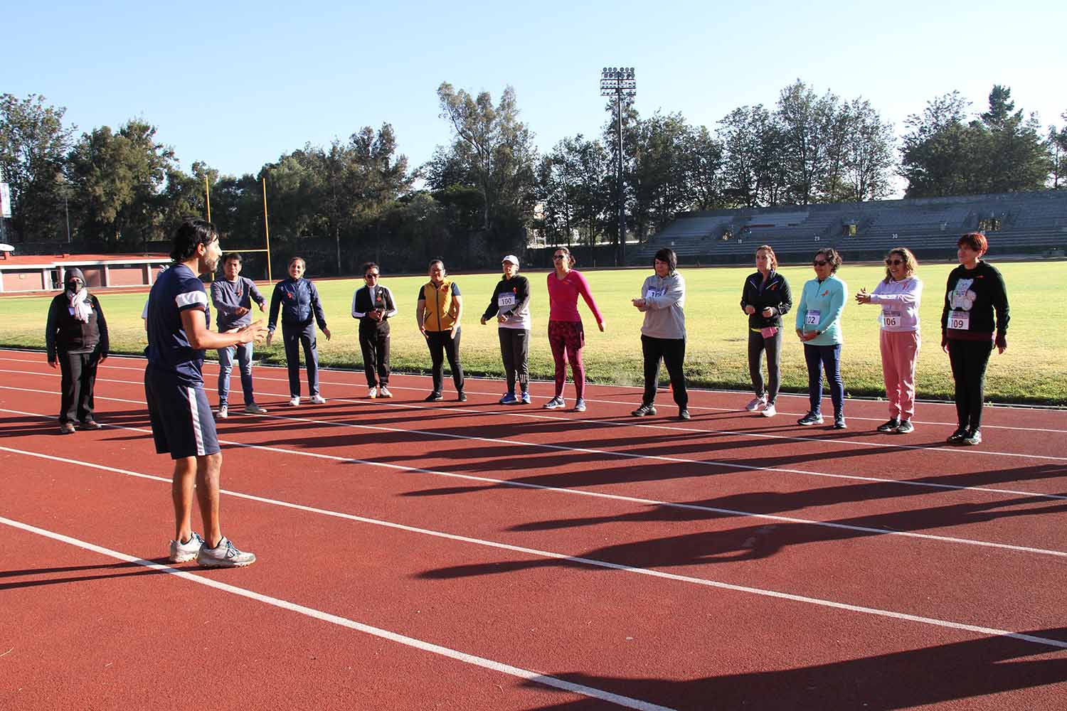 La jornada inició con ejercicios de movilidad y calentamiento a cargo de Miguel Ángel Ramírez Hernández, instructor de la Dirección General del Deporte Universitario (DGDU), quien realizó dinámicas divertidas y de integración que prepararían a los participantes para arrancar la carrera-caminata, la cual consistió en correr, trotar o caminar durante 30 minutos en la pista de tartán, disfrutando del sol y del clima fresco que favoreció el evento.