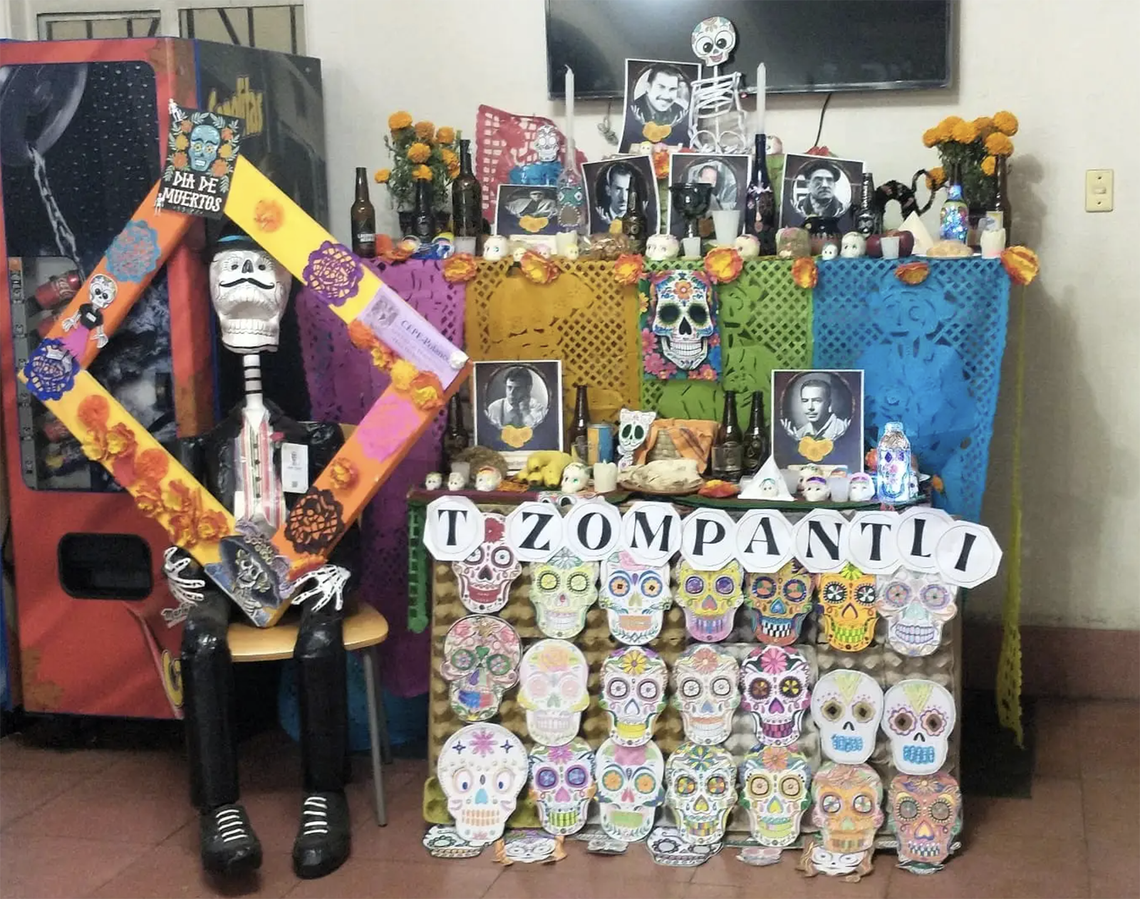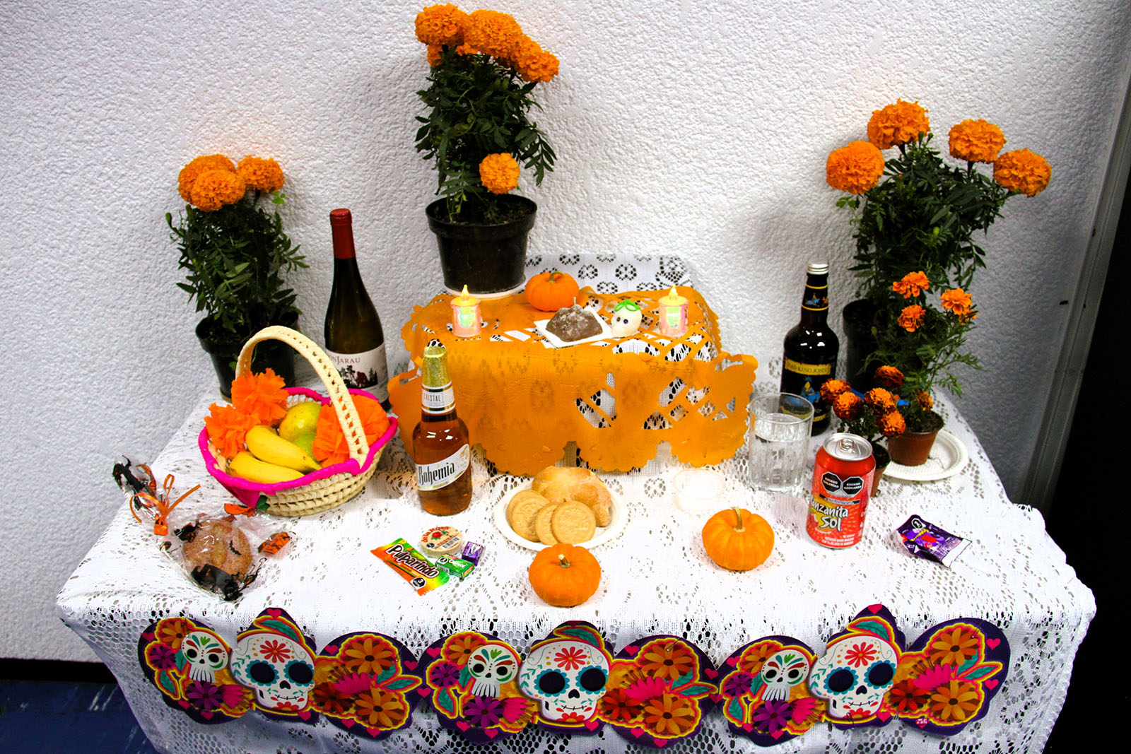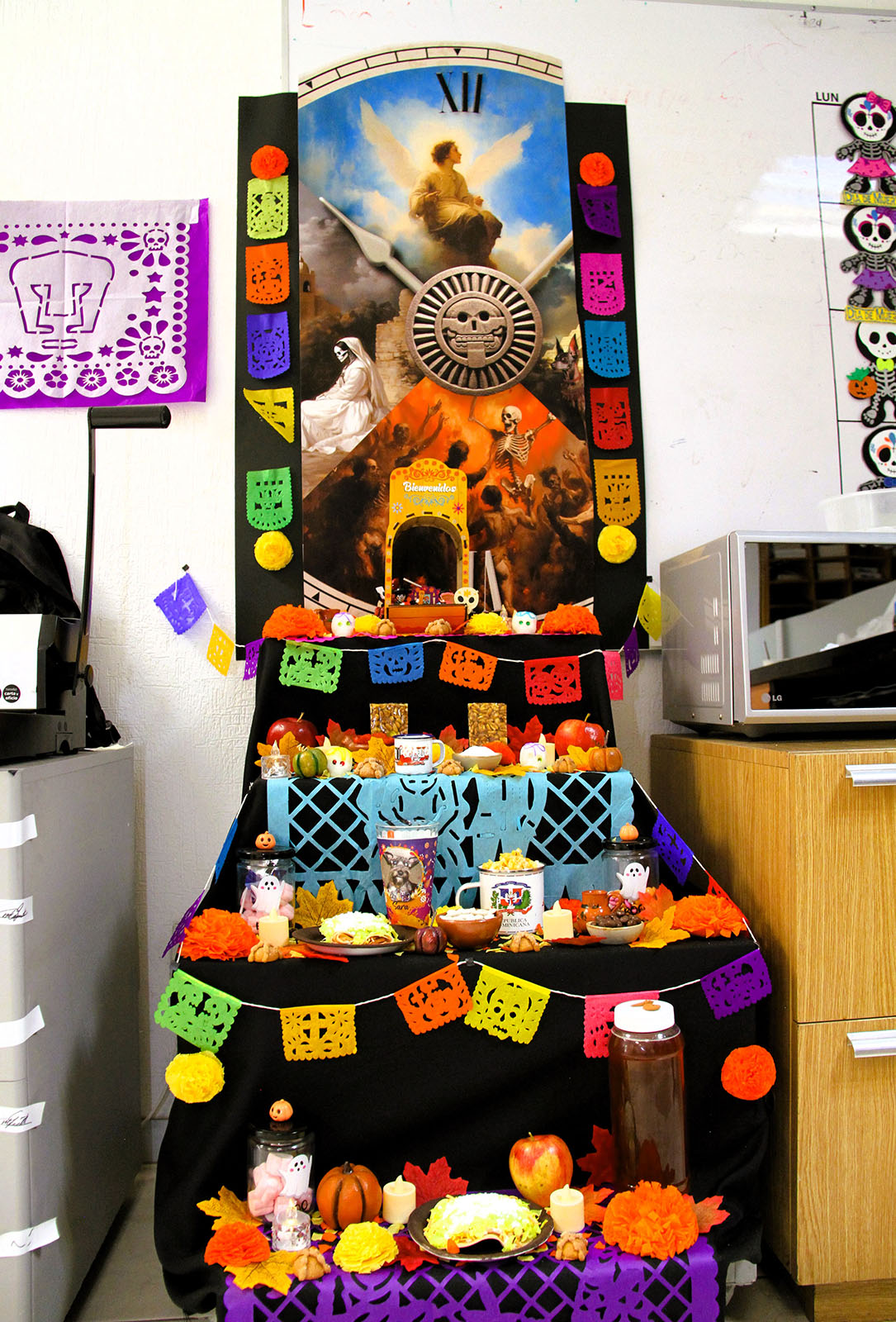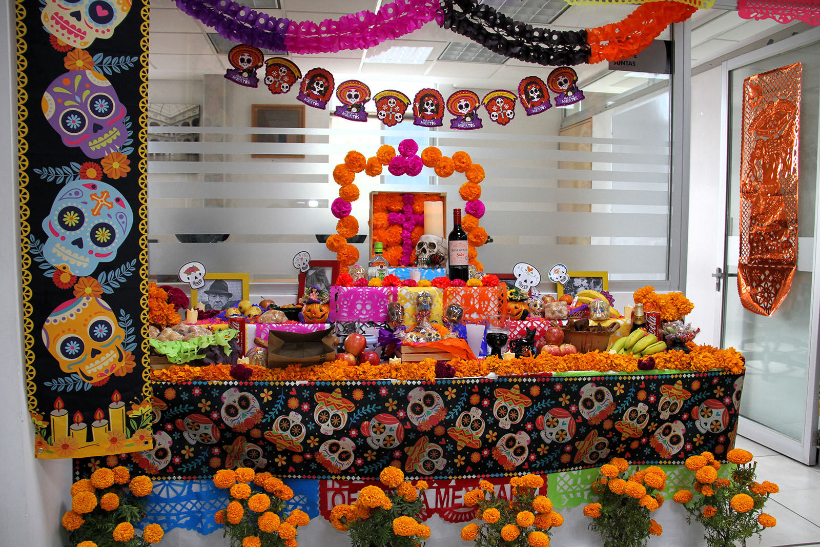 Rodeada de flores de cempasúchil y coloreada con papel picado, la ofrenda principal, custodiada por la muerte vestida para la ocasión, incluyó una variedad de deliciosos alimentos y bebidas para todos los gustos. El corazón del altar, representado por un reloj que simbolizaba el paso del tiempo, mostró en cuatro puntos cardinales el cielo, el infierno y la importancia de la muerte para las culturas prehispánicas, que creían en el regreso del espíritu de los muertos al mundo de los vivos.