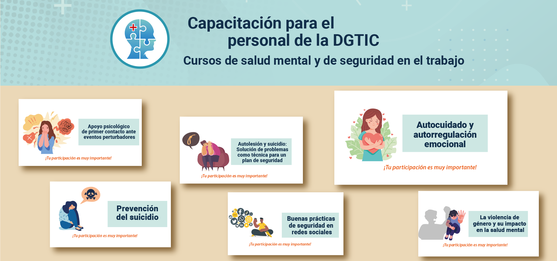 Derivado de la revisión de los protocolos generales en materia de seguridad aprobados por la Comisión Especial de Seguridad del H. Consejo Universitario, durante la segunda quincena de agosto se llevó a cabo la Jornada de Cursos de salud mental y seguridad en el trabajo, dirigida al personal de la DGTIC. La organización estuvo a cargo de la Comisión Local de Seguridad y la Comisión Interna para la Igualdad de Género (CInIG) de la dependencia, en colaboración con especialistas de la Facultad de Psicología de la UNAM.