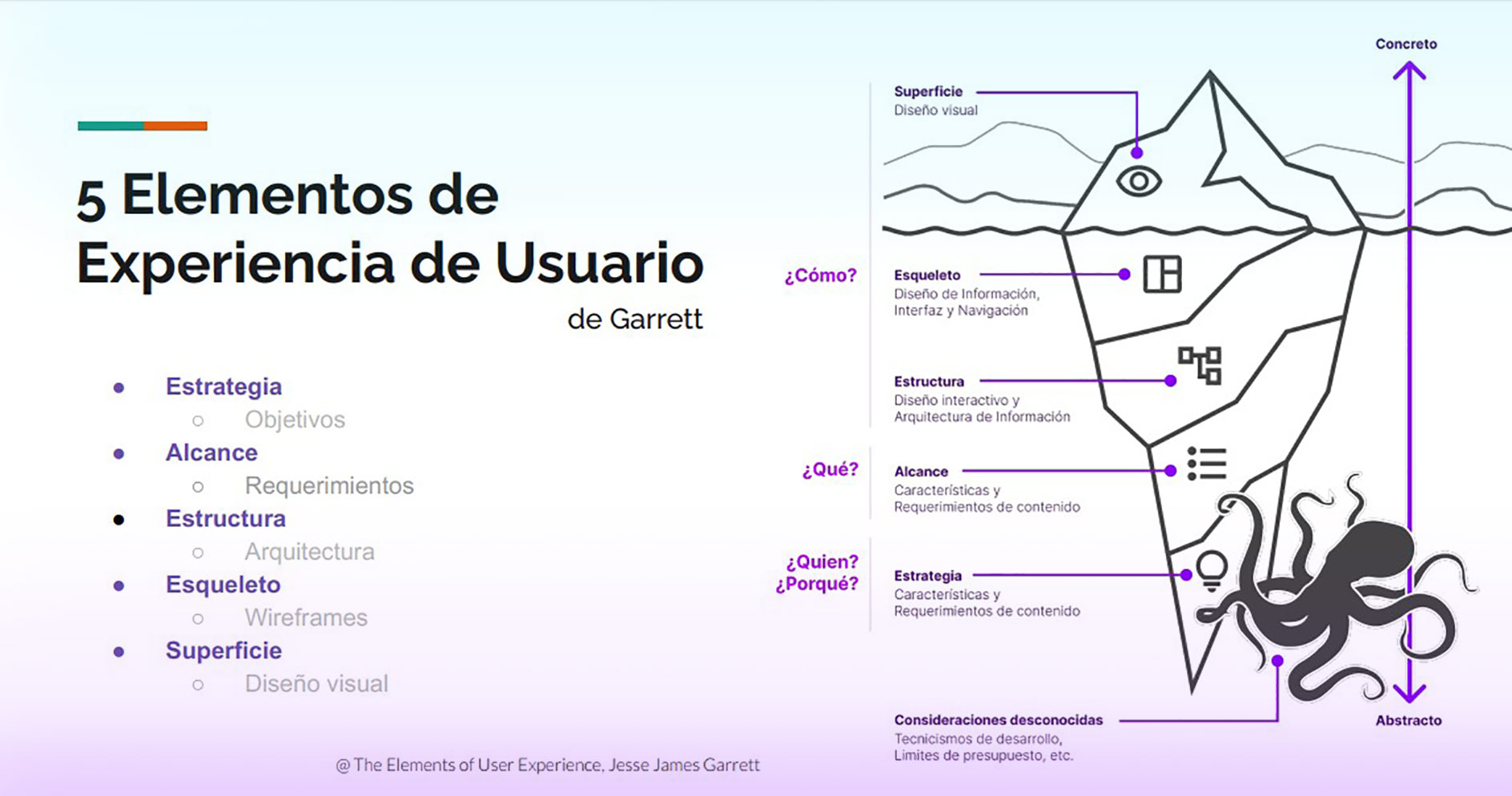 Siguiendo el modelo del diseñador de experiencia de usuario Jesse James Garrett, el ponente explicó los elementos fundamentales del diseño UX, representado como un iceberg que integra tanto capas profundas como visibles del proceso. Estas capas se dividen en cinco etapas: estrategia, que define el propósito y los problemas a resolver; alcance, donde se delimitan las funcionalidades; estructura, que organiza la información de manera accesible; esqueleto, centrado en los layouts iniciales; y superficie, que incluye los detalles visuales que aseguran una experiencia coherente y atractiva.