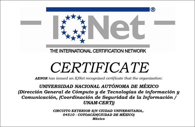 Con base en una auditoría que revisó el cumplimiento del estándar internacional por parte de una autoridad certificadora en la materia, IQNet renovó el pasado 16 de abril, la Certificación ISO 27001:2013 para el periodo 2020-2023, la cual permitirá que UNAM-CERT participe en proyectos de colaboración internos y externos y garantizar que la protección de la información en la UNAM, a través de la detección, gestión y análisis que se relacionan con el servicio de Respuesta a Incidentes, cumpla con las normas internacionales.